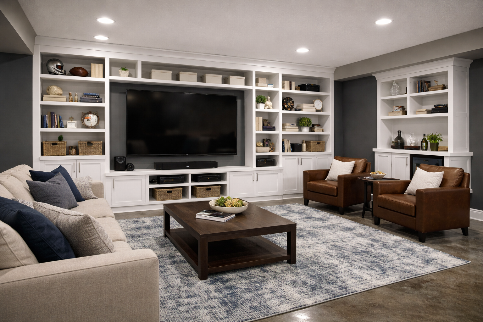 Many clients choose to combine media room projects with closets, offices, pantries, mud rooms, and/or alcove cabinetry—allowing multiple spaces to be completed at once.