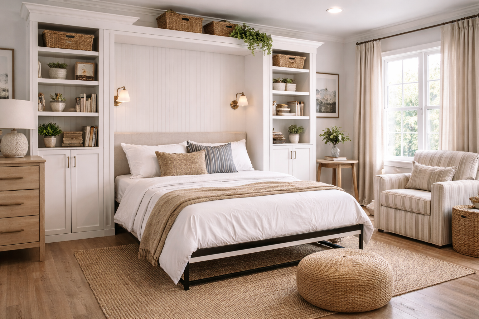 Many clients choose to pair wall beds with closets, offices, craft rooms, or children’s room storage, allowing multiple spaces to be completed as part of one coordinated project.